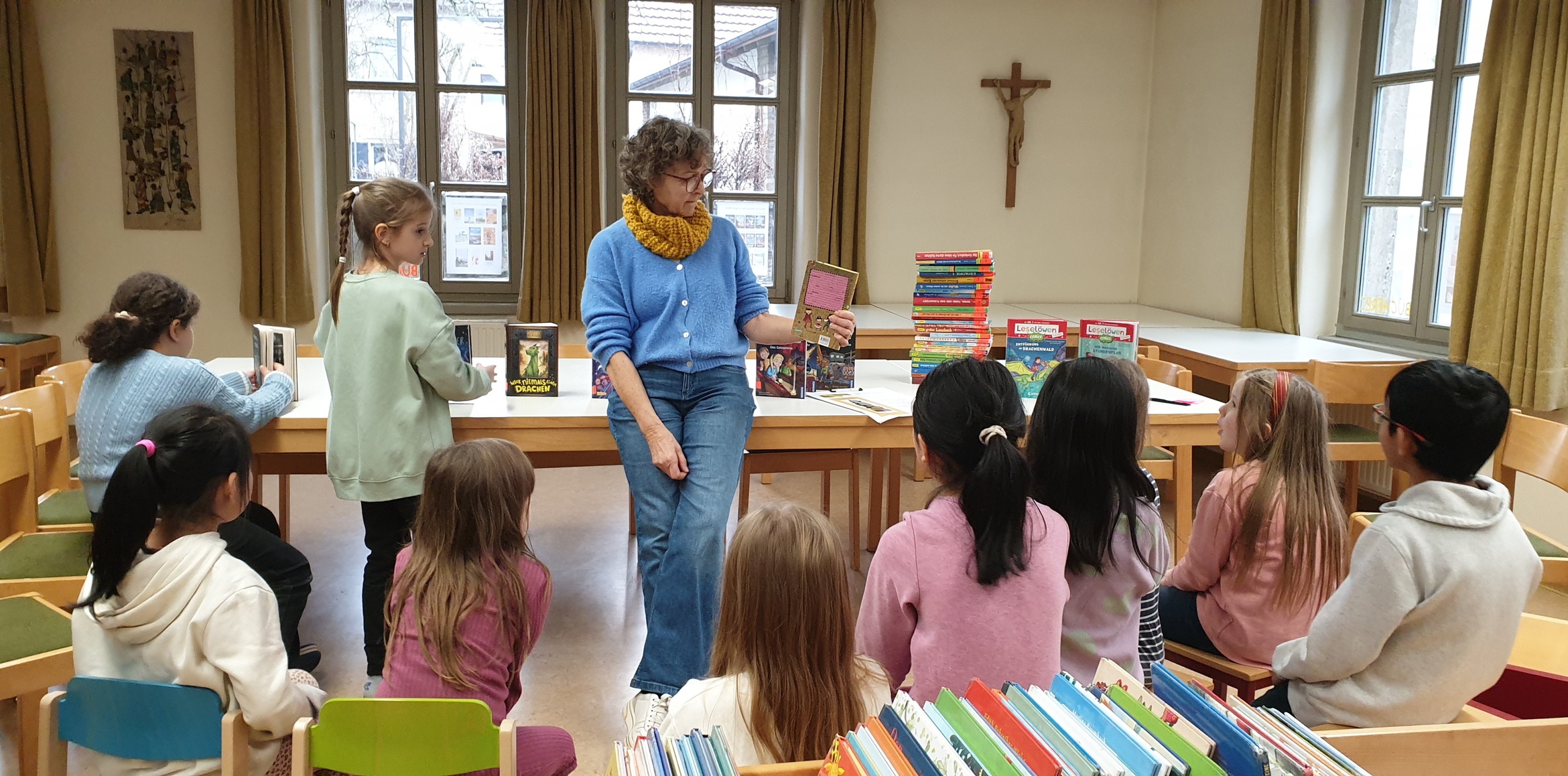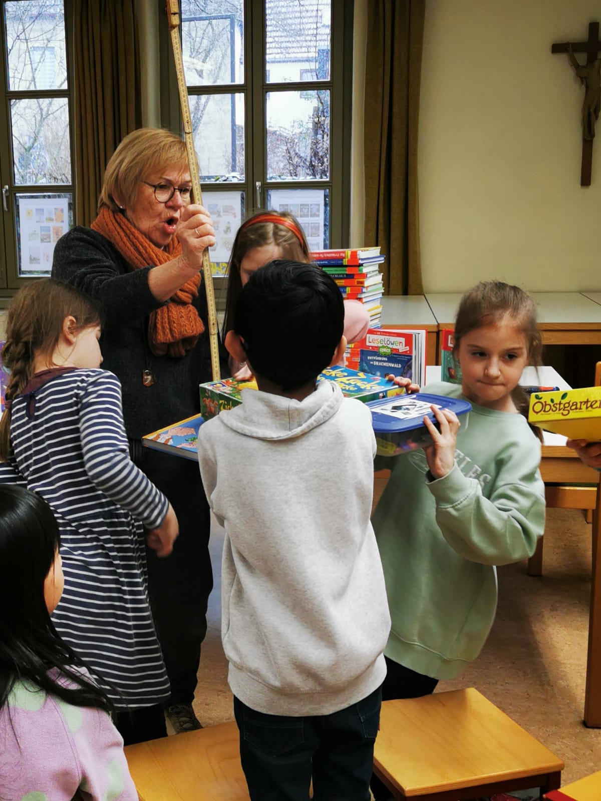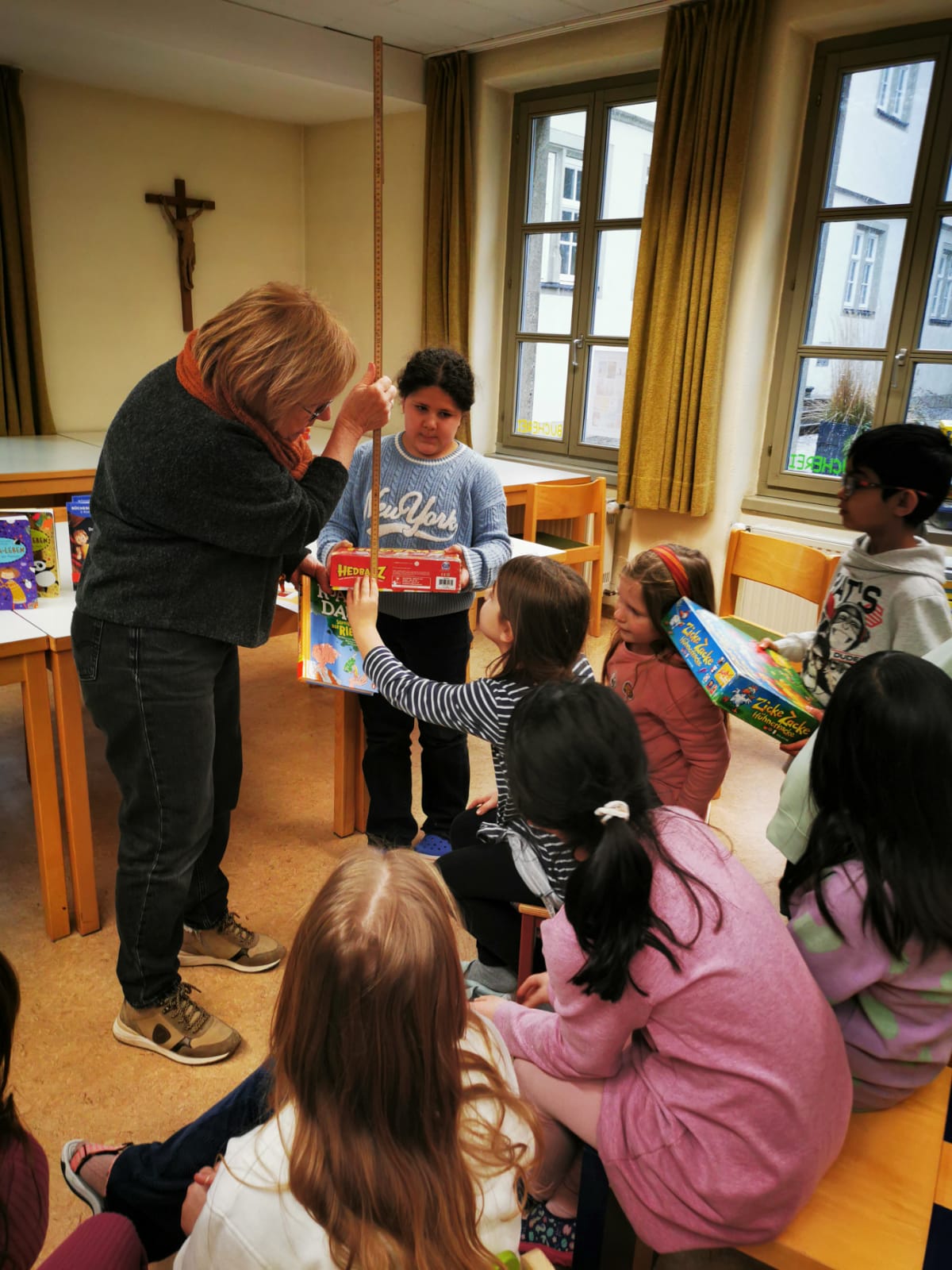 Messlatte, Metermaß und ein Bücherstapel waren die Hilfsmittel, mit denen der Start der Lese-Wette den Schülerhortkindern verdeutlicht wurde. Um das Ziel einen Bücherstapel bis zur Decke zu erreichen, müssen die Kinder viel lesen. Und der Anfang wurde gleich gemacht. Von jedem ausgeliehenen Buch wurde die Dicke in Zentimeter gemessen und in eine Liste eingetragen. So sind mit dem Start die ersten 13 Zentimeter der Strecke bereits zusammengekommen. 270 cm warten noch.