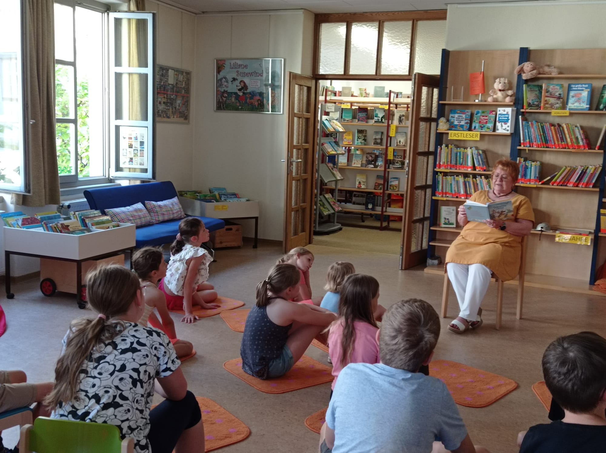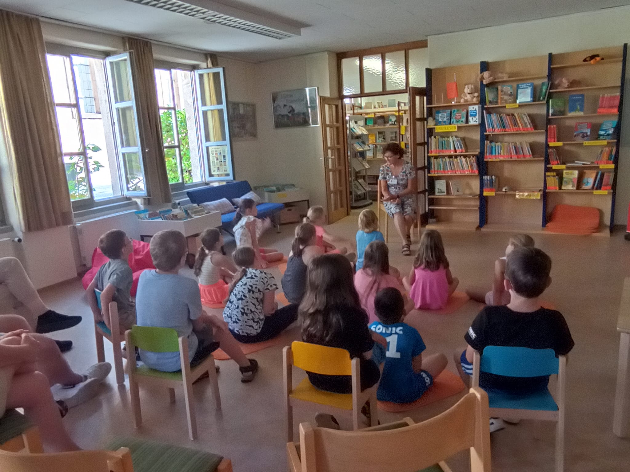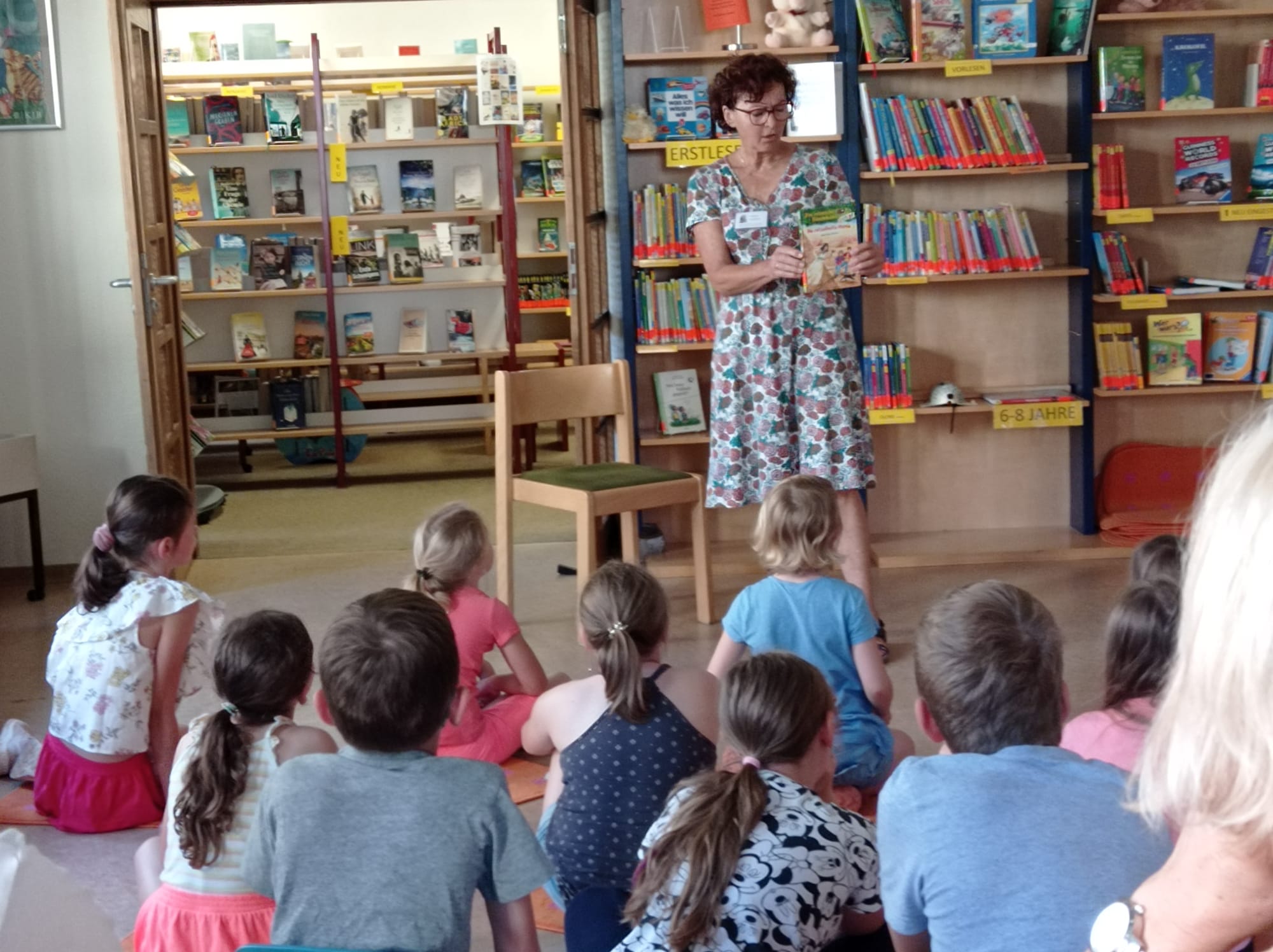 An einem Ferienvormittag machten sich die Kinder vom Schülerhort Herschfeld auf den Weg zu uns. Sie lernten unsere Bücherei kennen und durften in den Regalen stöbern und sich ein Lieblingsbuch aussuchen. So konnten die Kinder einmal sehen, wo einige der Bücher ihrer Hortbibliothek immer herkommen. In regelmäßigem Austausch bringt nämlich die Büchereimitarbeiterin Johanna Saal eine große Tasche voller Kinderbücher dort vorbei und sie kennt mittlerweile die Vorlieben der Kinder. Mit einer Vorlesegeschichte und Wortspielen verging der Vormittag wie im Flug.