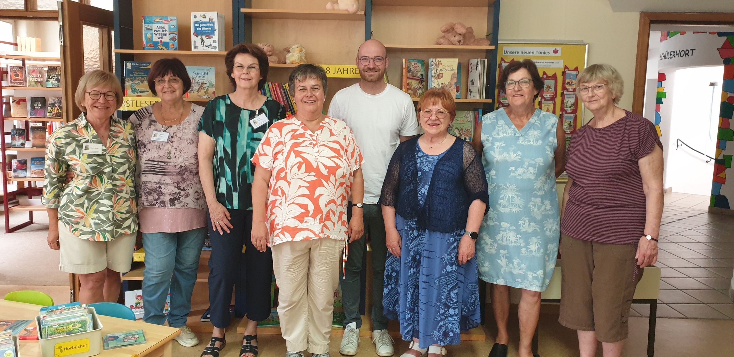 Foto von links: Doris Grob, Burgis Ritter, Heike Wirsing, die Gäste Heidi Heinrich und Elias Huisl, Christina Schmitt, Johanna Saal und Rita Hartmann vom Büchereiteam.