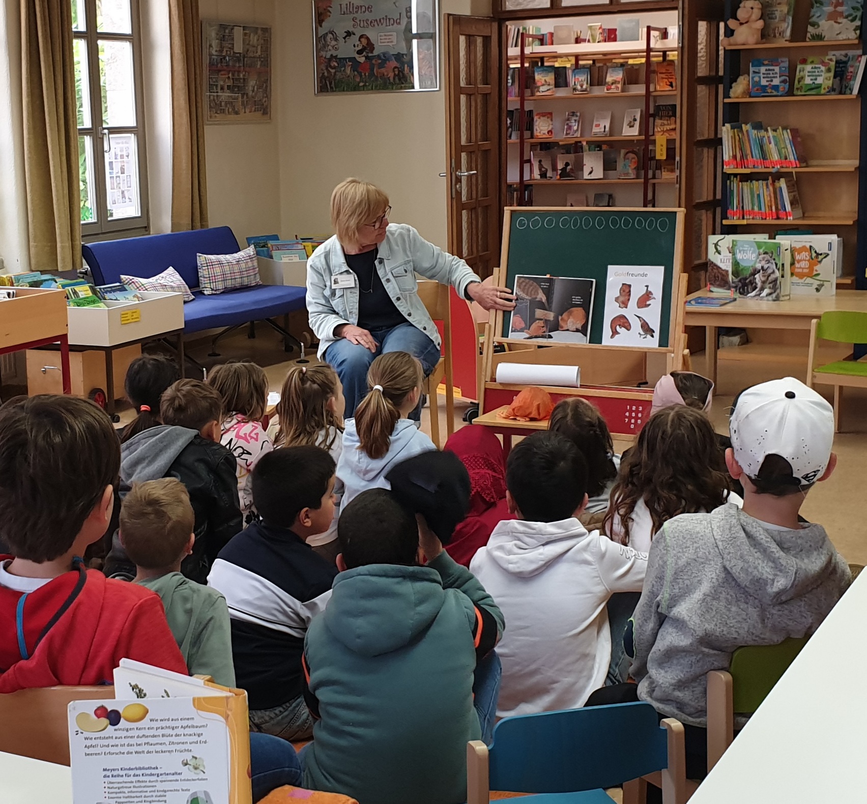 Das kleine Einmaleins beherrschen sie schon ganz gut, die Kinder der drei zweiten Klassen der Grundschule. Und wie man einen Goldschatz gerecht in vier Teile teilt, hörten sie bei der Mitmachgeschichte von den vier Goldfreunden bei einem Besuch in unserer Bücherei. Die Klassenleiterinnen der 2. Klassen nahmen das Angebot des Büchereiteams für eine Büchereischnupperstunde gerne wahr, wird doch damit das selbständige In-die-Bücherei-gehen und die Lesekompetenz der Kinder gefördert. Nach der Vorlesegeschichte wurde die Zeit genutzt, um die Lieblingsbücher zu finden und auszuleihen.